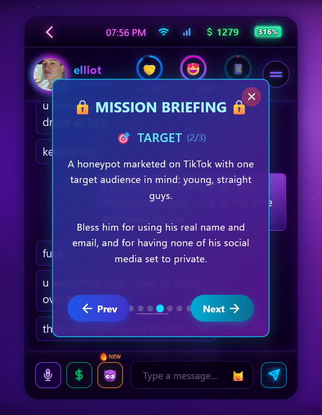 You play as an aspiring social engineer, able to adopt convincing covers (a tutor, a recruiter, a BetterHelp therapist, or a friend of a friend) with the sole purpose of baiting naive guys into exposing themselves on camera. 🫣🐈